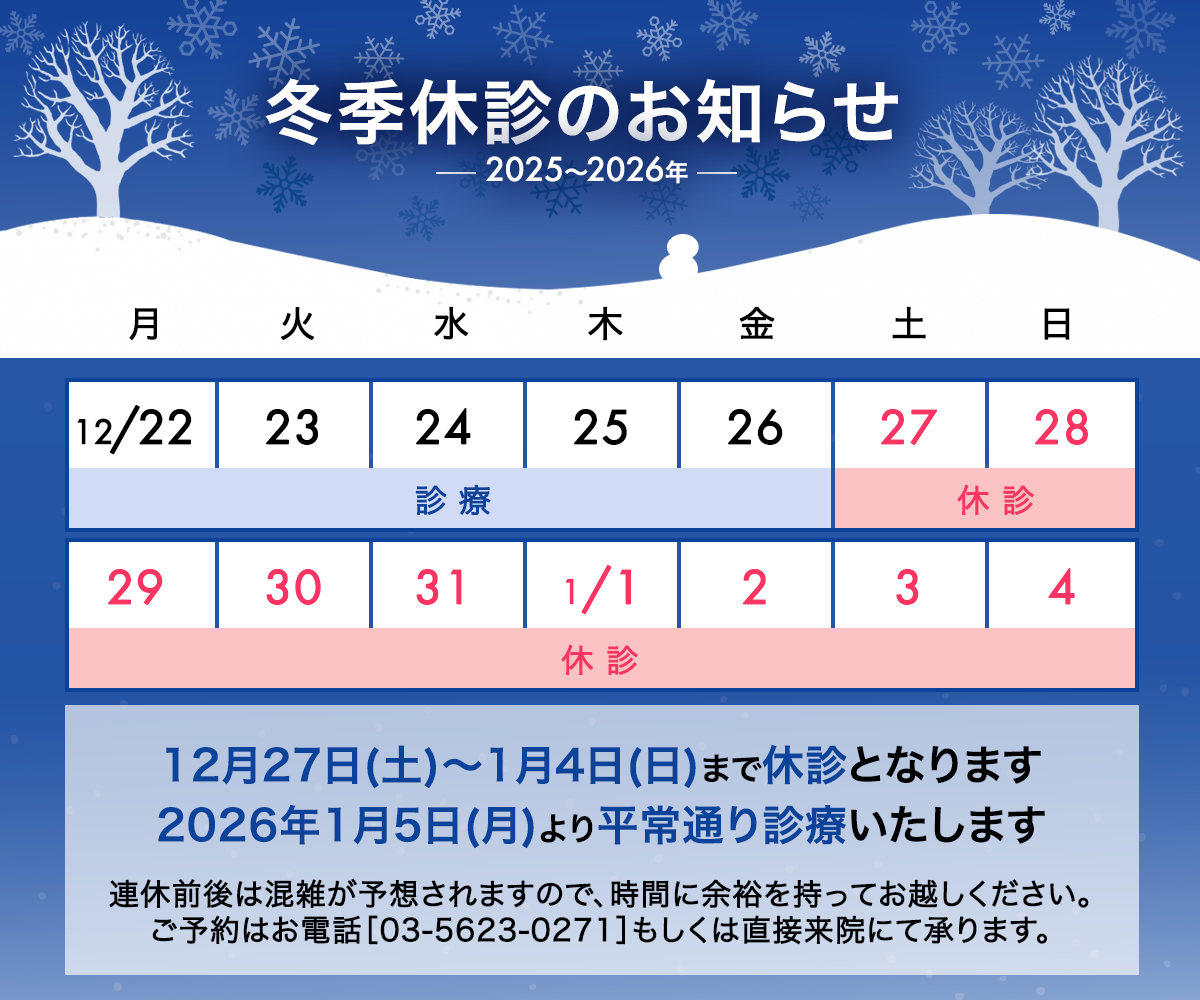 冬季休診のお知らせ:12月27日(土)〜1月4日(日) 休診になります。